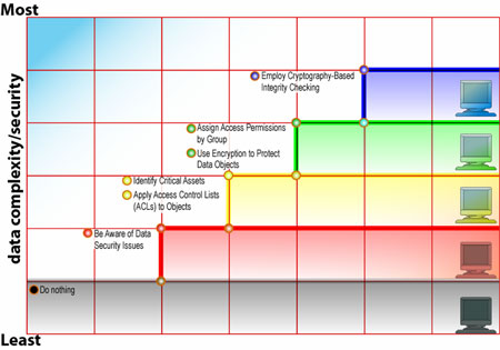 בגְּרָף זה אדום מסמל סכנה, בורות והזנחה אם הארגון אינו מודע לשיקולים החשובים בהגנה על נכסיו. צהוב מצביע על פעולות בהן יש לנקוט בהקדם האפשרי. הירוק מראה רמה מתקבלת של הגנה בהשוואה לממוצע בארגונים בעלי מודעות לאבטחה. כחול שמור למתקדמים ויש לשאוף אליו בהתאם לצרכים עסקיים, מדיניות, דרישות אבטחה וקריטיות של כל נכס.